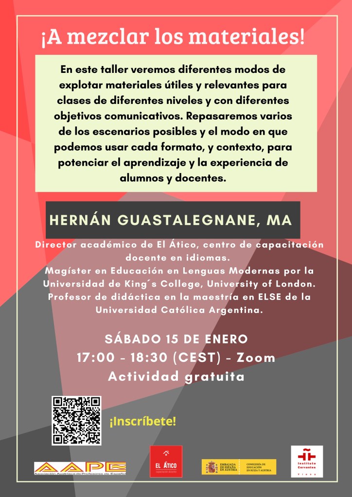 En este taller veremos diferentes modos de explotar materiales útiles y relevantes para docentes y estudiantes a usar en clases de diferentes niveles y con diferentes objetivos comunicativos. Los materiales serán desarrollados para las diferentes etapas de la clase y veremos el modo de lograr que sean multinivel y multiestilo. Mientras analizamos los materiales y su uso didáctico, repasaremos varios de los escenarios posibles y el modo en que podemos usar cada formato, y contexto, para potenciar el aprendizaje y la experiencia de alumnos y docentes.